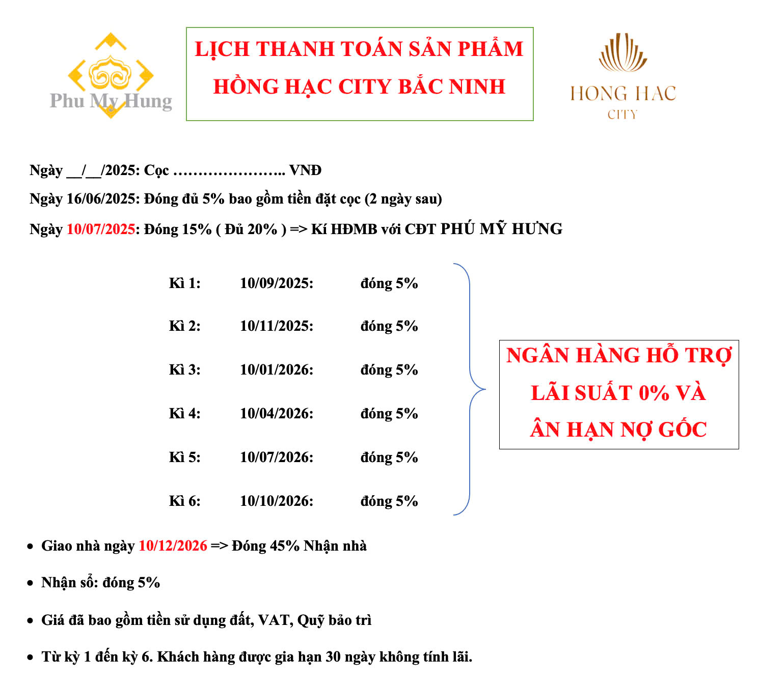 Lịch thanh toán chi tiết cho dự án Hồng Hạc City rất hỗ trợ cho khách hàng. Khi khách hàng chọn mua nhà tại dự án Hồng Hạc City thì chỉ cần thanh toán trước 20% cho đến khi nhận nhà. Cụ thể: